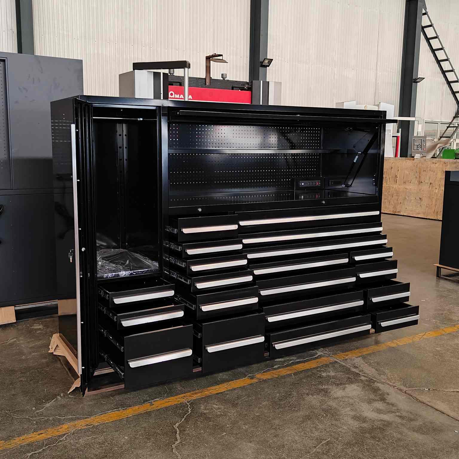 El gabinete de herramientas multifuncionales negras se puede usar en salas de trabajo de garaje, casas y talleres de reparación, y está equipado con bastidores de herramientas, tomas eléctricas y cajones de almacenamiento. El gabinete de herramientas multifuncionales negras de Cyjy ha brindado conveniencia para el taller de fábrica.