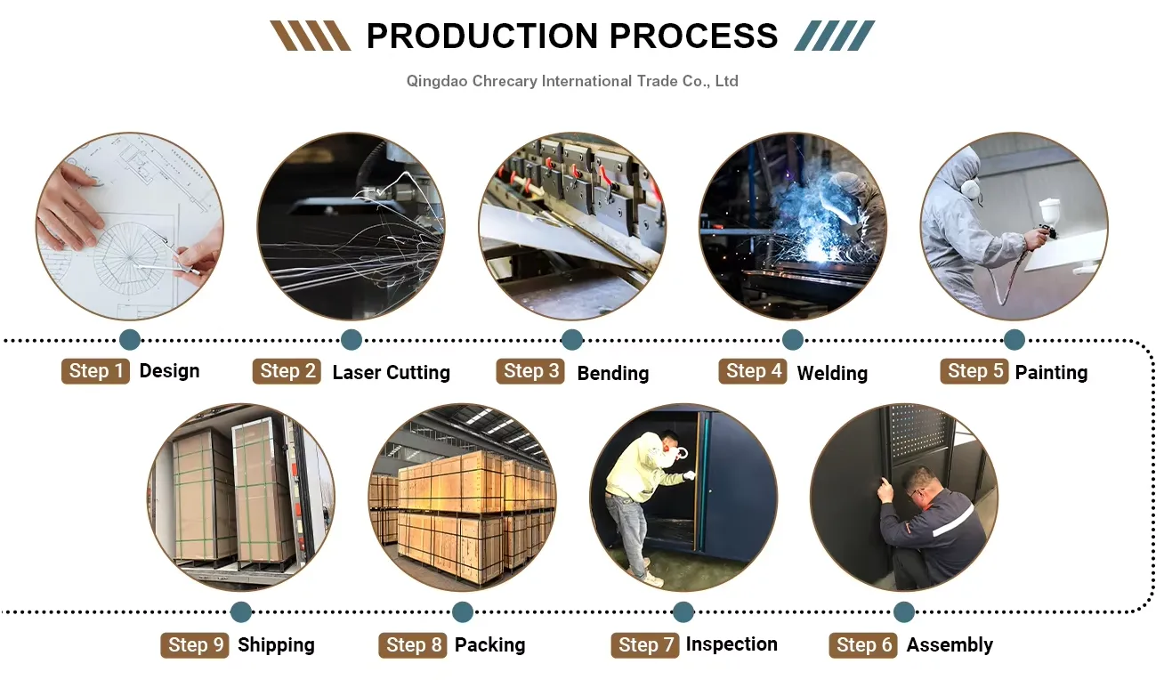 1. Adquisición de materia prima: las placas de acero enrolladas en frío de alta calidad se seleccionan cuidadosamente como el material principal para garantizar que la resistencia y la tenacidad del material cumplan con los altos estándares. Al mismo tiempo, se compran varios materiales auxiliares de alta calidad, como portaobjetos de rodamiento de bolas para cajones, cerraduras y ruedas.