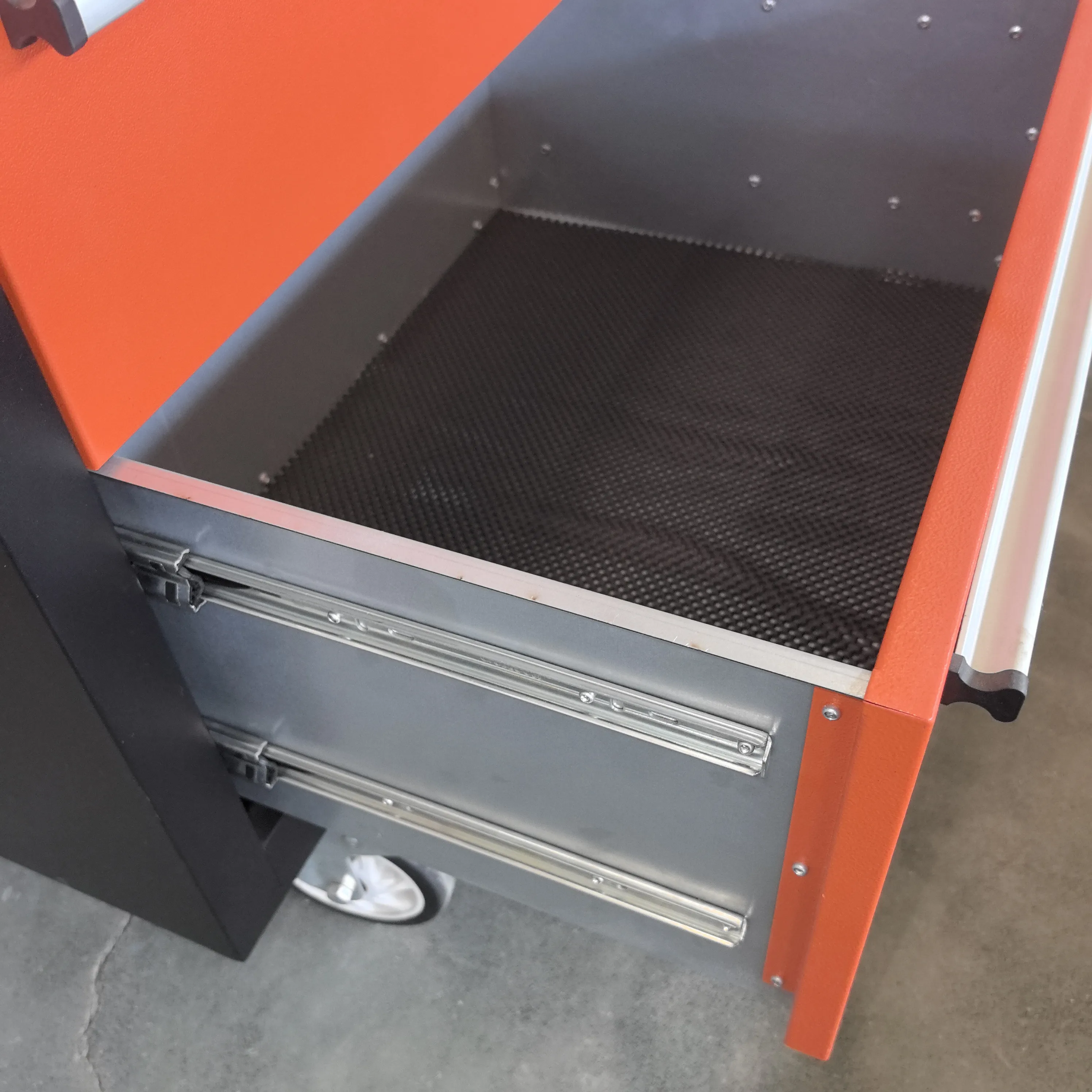 Los gabinetes de almacenamiento de herramientas se pueden personalizar con múltiples opciones de diseño, diapositivas de cajón de cierre suave con capacidad de extensión completa e insertos de revestimiento de cajones de espuma con recortes personalizables.